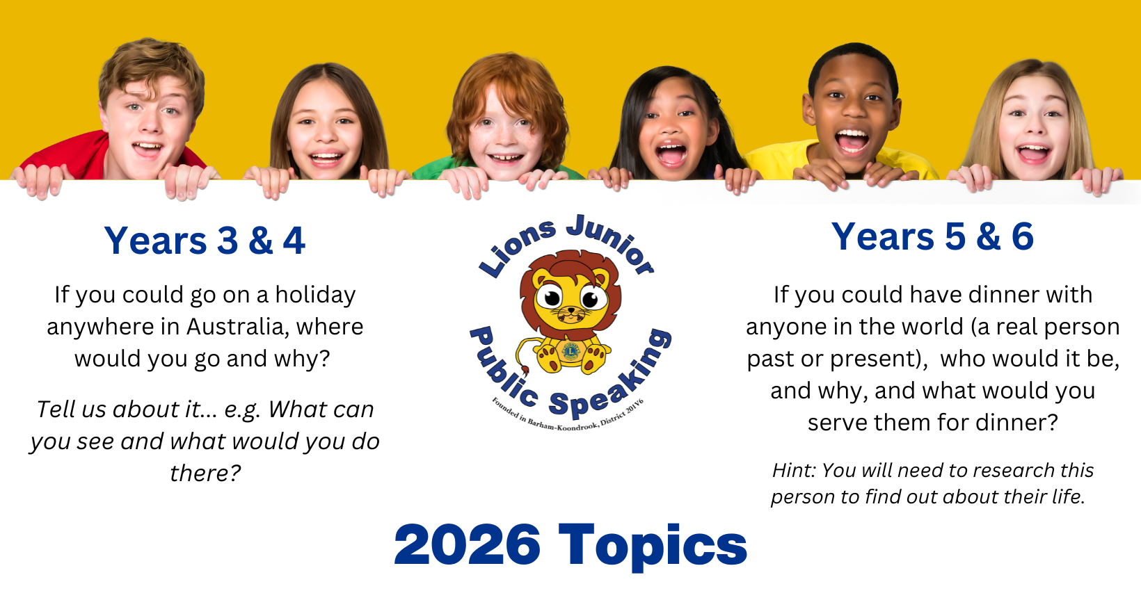 • Students are given a topic for their prepared speech, chosen by Lions, and this topic remains the same throughout the competition.  Their speech needs to be based on facts, but is open to their own imagination.